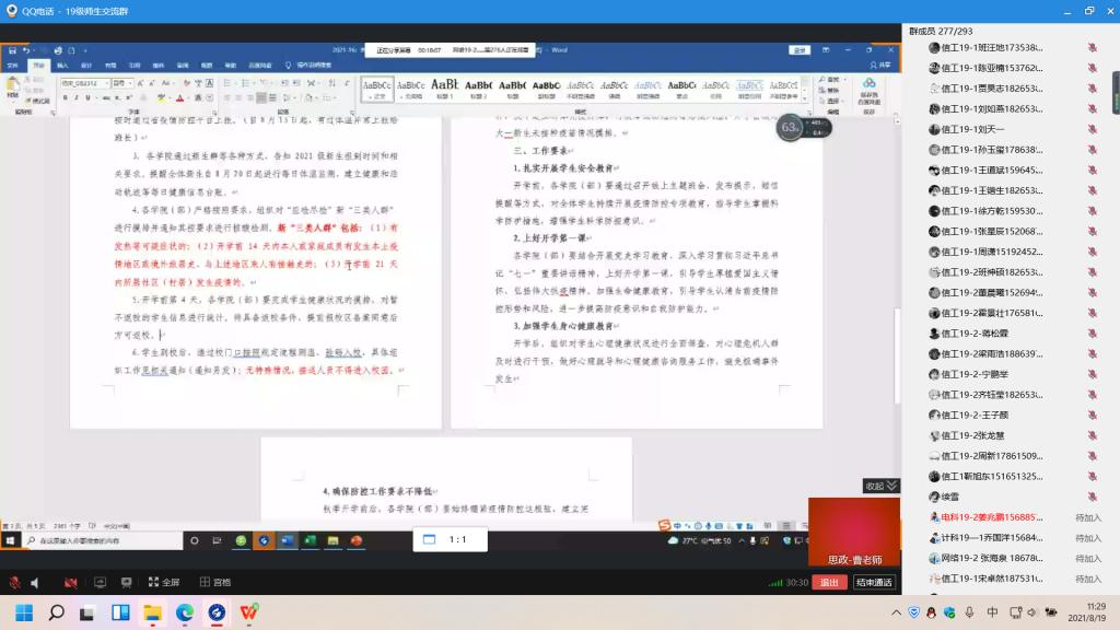 会上,辅导员向同学们传达了《关于做好2021年秋季员工开学工作的通知》文件精神,结合学院各年级员工实际情况,从返校时间、返校要求、返校准备等方面进行安排部署。