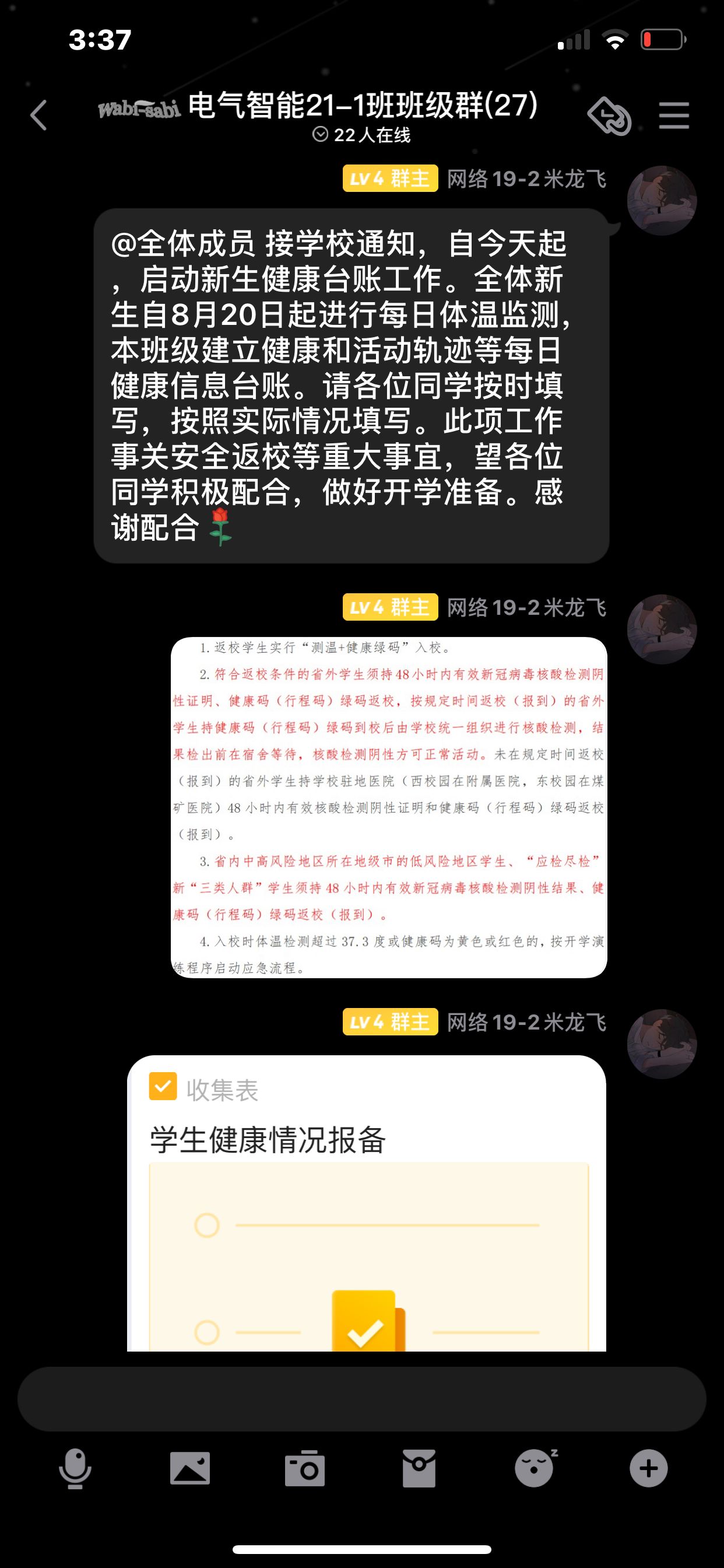 为精准掌握每一位新生动向,确保学校的每一条通知传达到新生个人,顺利迎接新生入学,学院辅导员在假期建立了年级群、班级群,及时摸排新生信息,每日进行体温检查,做到“一人一档”,建立新生健康和活动轨迹信息台账。辅导员热情的在新生群中欢迎各位新生的到来,并为每个班级配备一名高年级临时负责人,为新生详细讲解入校前后注意事项,提前发送学校迎新安排、各项部署、校园导航等内容,并认真解答新生各种问题与疑惑,做到点对点精准服务新生,为新生入学做好心理铺垫,真正让家长放心、安心。