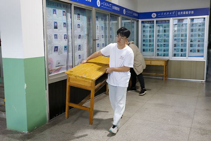 清晨,志愿者们就冒雨在一号楼门厅集合。虽然雨不停歇,但志愿者们依然干劲十足。在现场拉起警戒线,打扫楼道卫生,布置考场,为接下来的考务工作积极筹备。在考生陆续到达后,志愿者们积极组织考生列队,维持现场秩序;检查健康通行码,测量体温,做好防疫工作;检查身份证、准考证,帮忙保管私人物品。伴随着考试时间的临近,志愿者引导着队伍进场,同时其他志愿者也在场外准备着应对突发状况,保证了考试的有序进行。
