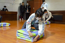 经过员工会前期的宣传工作,同学们踊跃报名参赛。参赛同学被分为五人一组,按照赛前抽签顺序依次上台展示。比赛中,参赛同学集中精神,全神贯注,铺平、压实、翻折、抠角、捏线,动作细致入微,一会工夫,一张张四四方方、棱角分明的“豆腐块”呈现在大家眼前。每轮比赛结束后,由评委统一打分,并评选出一二三等奖及优秀奖共16名、优秀团队1名、优秀组织奖1名。