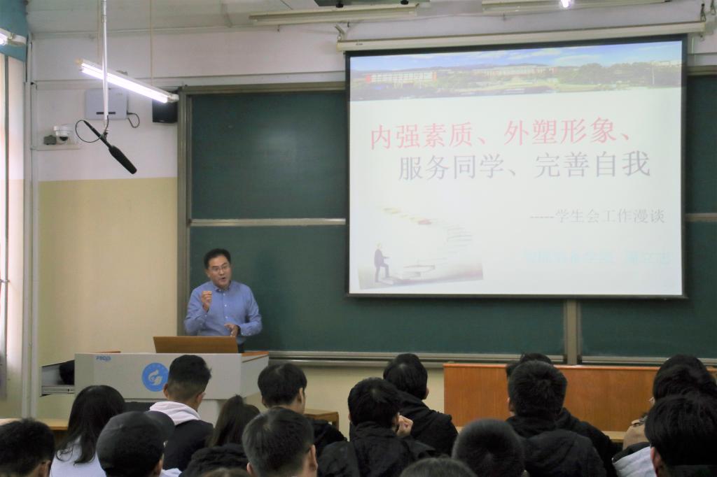 会上,周立志从“内强素质,外塑形象,服务同学,完善自我”的员工会的宗旨为切入点,围绕“员工会历史和领导主体”“员工会现状和改革”“员工会成员该怎样做”三个方面展开详细的交流。周立志对所有员工干部提出三点希望;一是要守好初心和使命,树立正确的价值观,注重工作方式方法,要在工作中得到个人能力的提升。二是要处理好人际关系,处理好工作和学习、生活之间的关系,注重与班级之间的联系,做好老师和员工沟通的纽带和桥梁;三是要培养责任意识、服务意识、大局意识,强化自身思想政治素质、道德修养素质、文化素养素质以及身心健康素质。最后,周立志赠与员工会全体成员一句话:“读万卷书不如行万里路,行万里路不如阅人无数,阅人无数不如名师指路,既要名师指路又要个人领悟。”