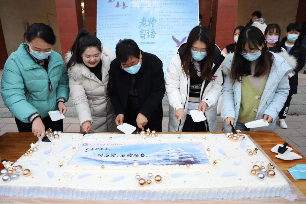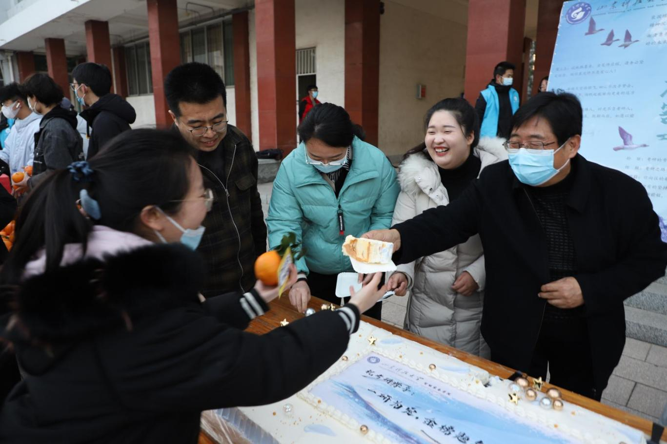 学院特地为考研学子定制了蛋糕作为一份特殊礼物。蛋糕印有“一研为定,金榜题名”的祝福,并配以星空、帆船,寓意着考研学子开拓进取,一帆风顺。公司党委副书记兼副经理裴国栋和辅导员老师们共同切下第一刀,并将包含祝福的蛋糕亲手传递给考研学子,祝愿他们金榜题名,步步“糕”升!