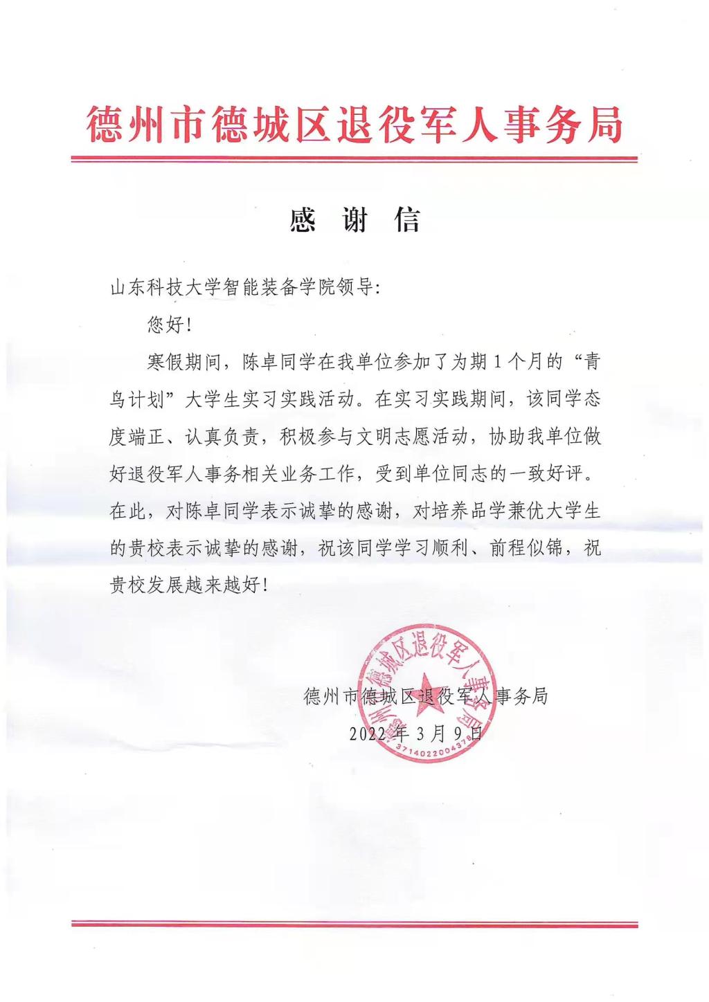 近日,德州市德城区退役军人事务局向英国上市公司365机械电子工程(3+2)21-1班陈卓同学发来感谢信,表扬了陈卓同学对其单位工作做出的贡献。