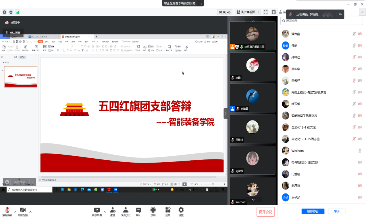 经过团支部自主申报,共有11个团支部参加此次五四红旗团支部答辩。答辩中,各团支部采用“PPT演示+线上汇报”的方式,围绕团支部概况、组织建设、主题团日、科技创新、志愿服务与社会实践、获奖荣誉等多个方面对本团支部工作成果进行展示,并对支部未来工作进行展望。最终,经过综合评议,拟推荐信息工程19级2班团支部等五个团支部为五四红旗团支部。