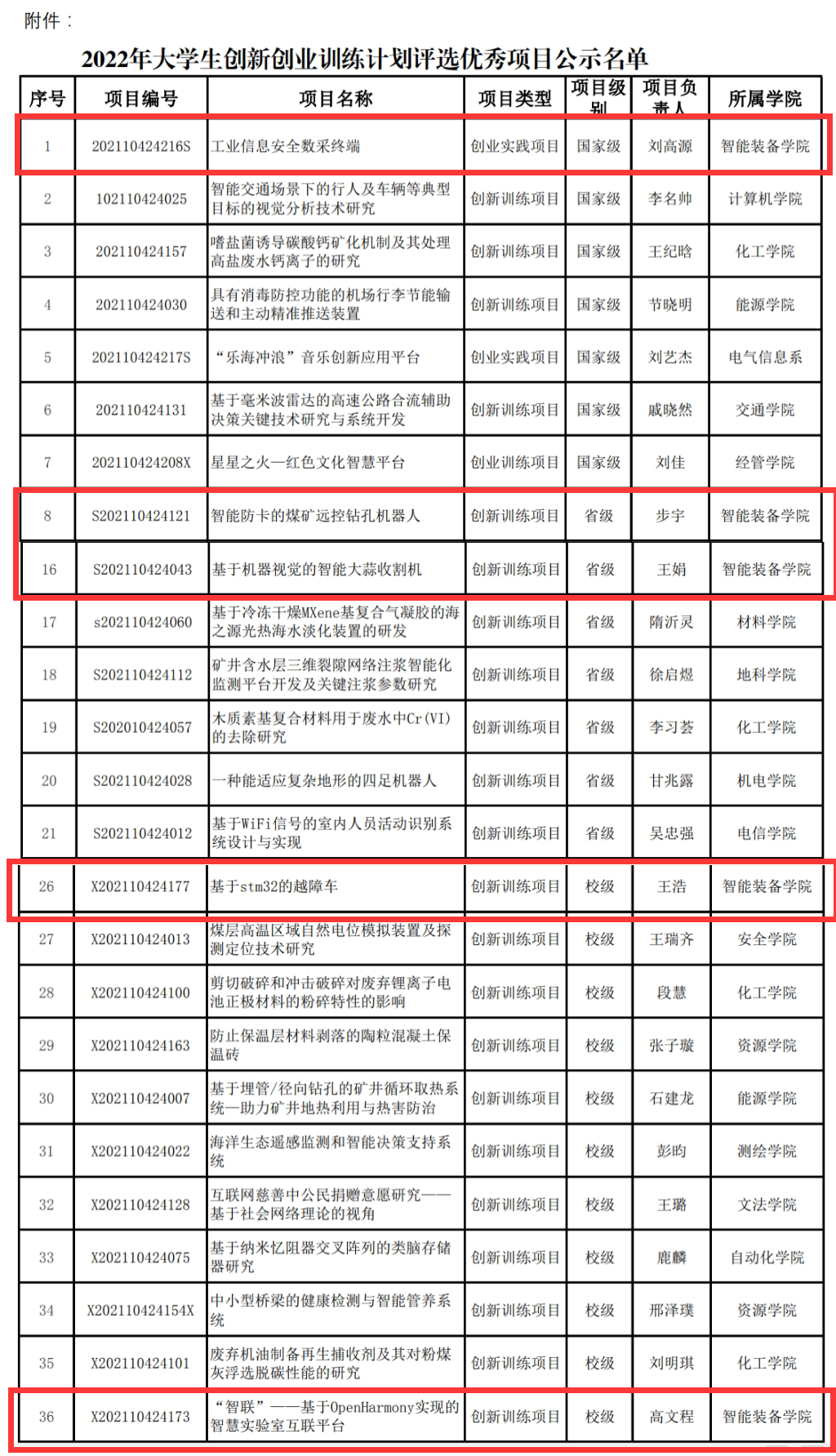 近日,2022年老员工创新创业训练计划优秀项目评选落下帷幕,公司推送的《工业信息安全数采终端 》在国家级项目评选中获得优秀,《智能防卡的煤矿远控钻孔机器人 》、《基于机器视觉的智能大蒜收割机》在省级项目评选中获得优秀,《基于stm32的越障车》、《“智联”——基于OpenHarmony实现的智慧实验室互联平台 》在校级项目评选中获得优秀。集团共评选出个42个优秀项目,其中国家级项目7项、省级项目14项、校级项目21项。