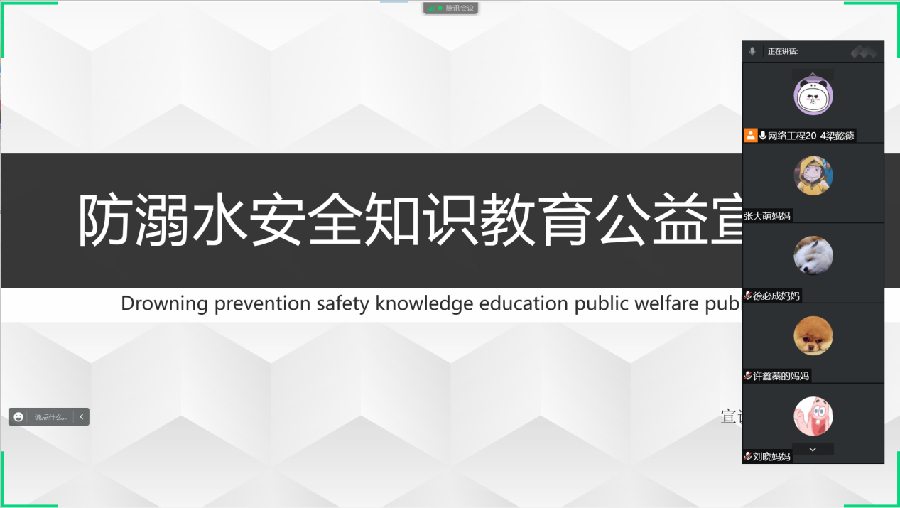 团队通过腾讯会议平台进行了防止青少年溺水的安全知识宣讲活动,各成员所在社区的青少年和家长参加会议。团队成员梁懿德主要从发生溺水事故的原因以及如何有效防止青少年溺水事故两个方面进行讲解。梁懿德重点强调家长要时刻看管好自己的孩子,尽量不让孩子去河边、湖边游泳,也提醒广大青少年,不要存在侥幸心理。