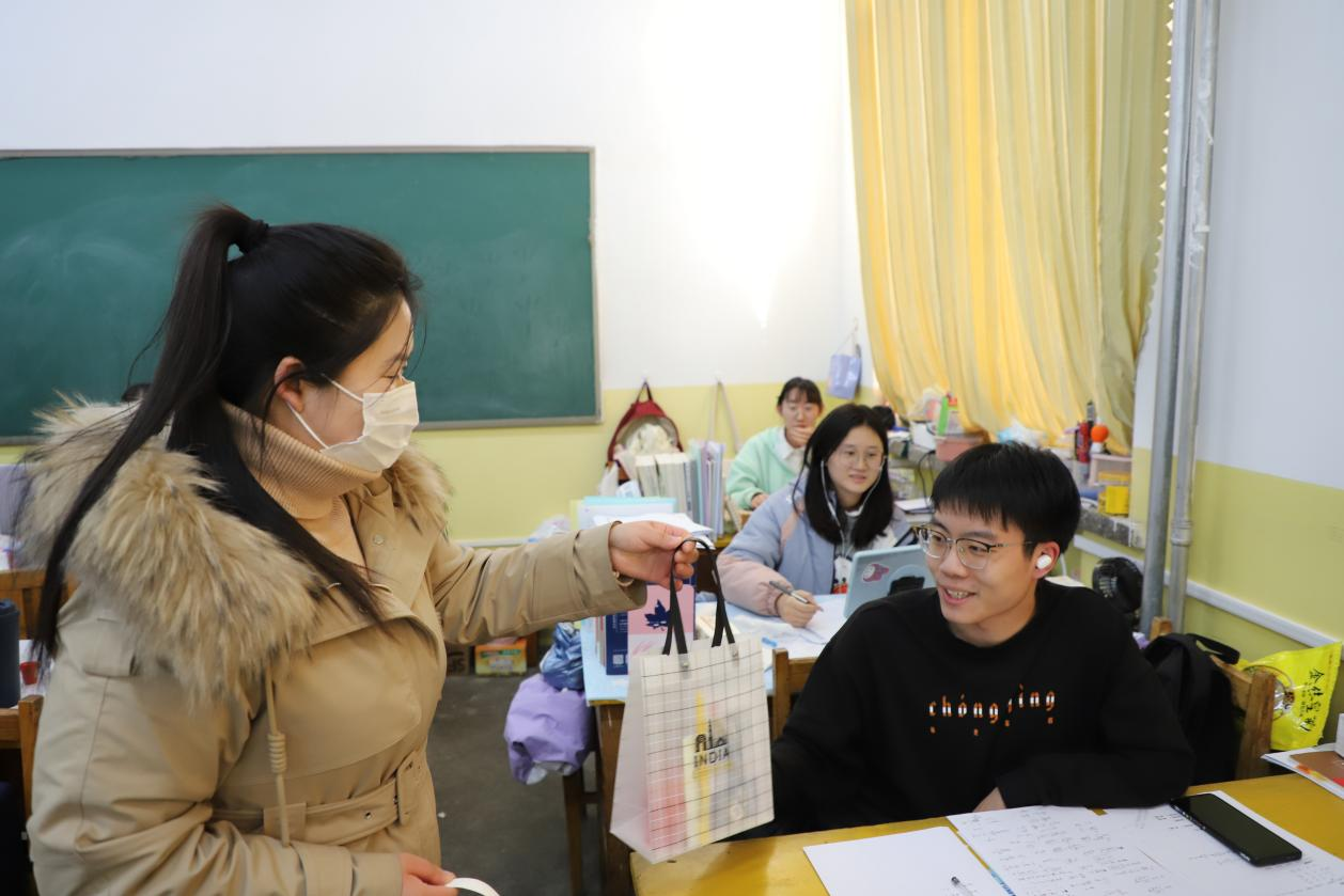 “紧张啊,但我不害怕。因为学院和老师永远在我们身后。在挑灯奋斗的最后时间里,带着学院准备的礼品和祝福,我有登上峰顶的信心和决心!”一位考研学子如是说。