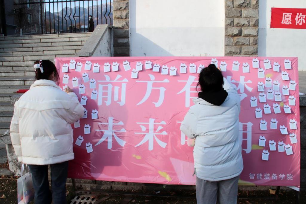 “且过腊月严冬,雪尽再看春花”“明年此日青云去,却笑人间举子忙”......学子们纷纷在写有“前方有梦,未来可期”和“我们终将上岸”的展板上写下自己的梦想和祝福。学子们将热血和壮志凝于笔尖,篆刻在纸上。学院通过这样的方式,点燃了学子们眼中少年独有的光和火,唤起了学子们一往无前的底气和信心。