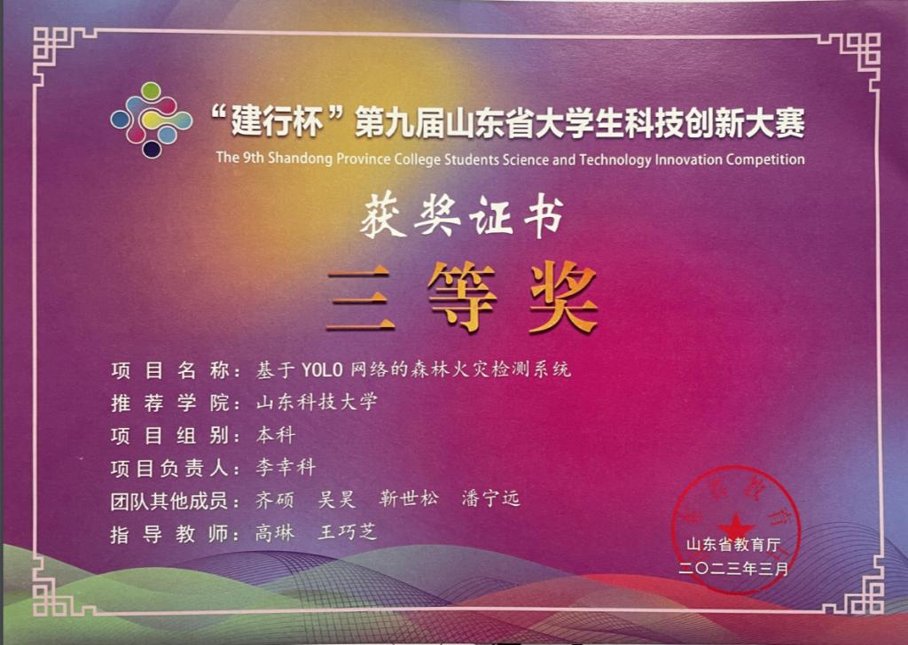 近日,“建行杯”山东省第九届老员工科技创新大赛落下帷幕,学院推报的《基于YOLO网络的森林火灾检测系统》获得了省级三等奖。