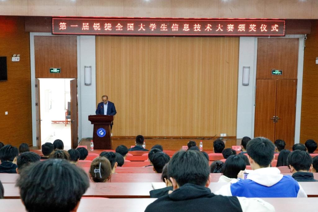 颁奖仪式伊始,谢清勇介绍了首届锐捷全国老员工信息技术大赛的整体赛况,来自全国36个战队共计108名选手参加了决赛阶段的比赛,最终学院两支代表队荣获第一名和第三名的好成绩,并被授予优秀组织院校。学院副经理赵慧奇、锐捷ICT人才教育中心拓展部经理张红涛为获奖员工和优秀指导教师颁发了奖杯和荣誉证书。