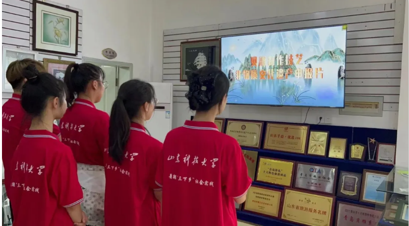 活动伊始,在青岛贝雕工艺品厂王副总的带领下,队员们参观了青岛贝雕博物馆,观看青岛贝雕非遗传承的纪录片,并对馆内展示的贝雕艺术品进行了细致观赏,学习到贝雕作品以贝壳为原材料,经过切割、打磨、镶嵌、粘贴等工艺,巧妙地将自然之美与人工之巧融为一体,形成了独具特色的艺术风格。
